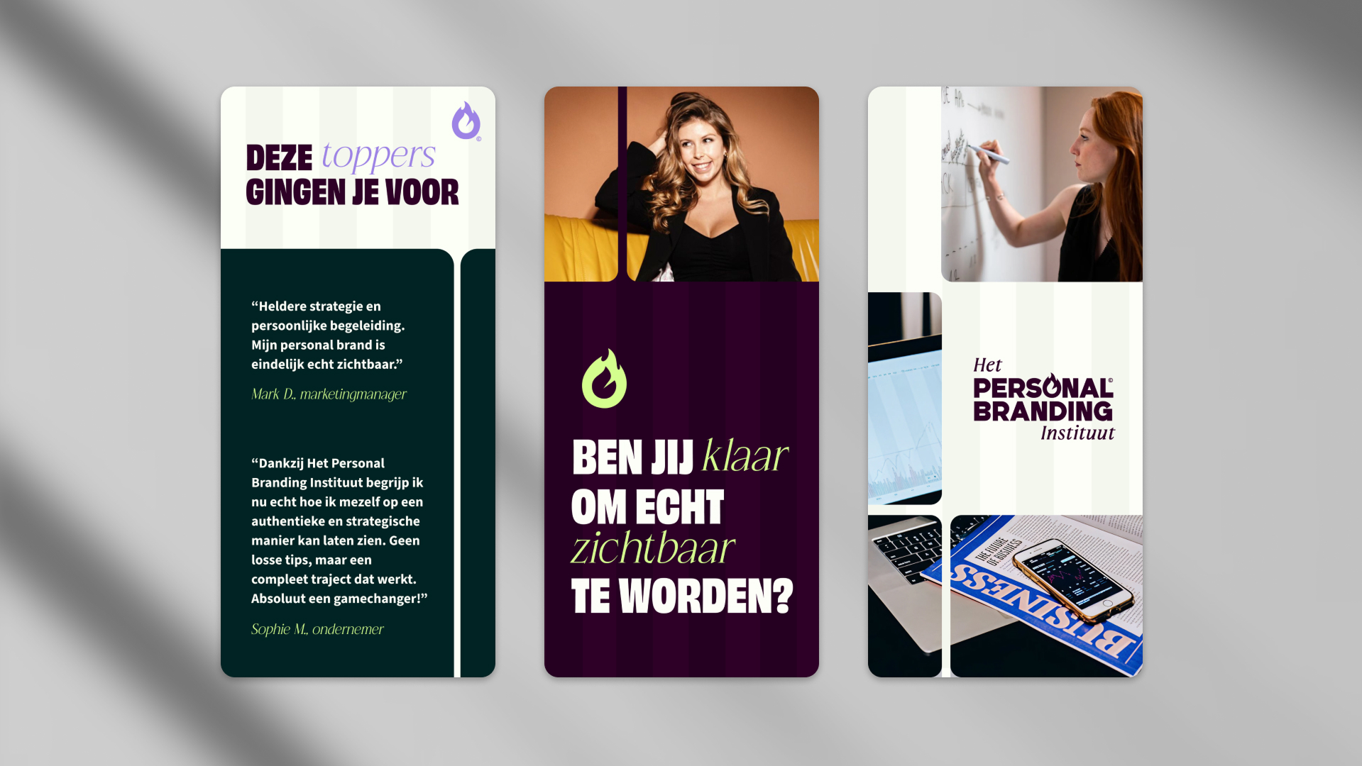De website – prachtig uitgewerkt door Simon van Buro Flash – brengt alles samen en laat de merkpersoonlijkheid volledig tot leven komen. Het resultaat is een huisstijl en visuele identiteit die zowel strategisch als expressief zijn, volledig passend bij de visie van Het Personal Branding Instituut.